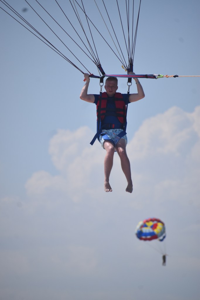 If you haven’t heard of Parasailing before, it’s where you’re strapped into a harness, hooked to a parachute, and towed behind a speedboat, at around 300 feet in the air. Here’s a photo of me in my equipment 🪂